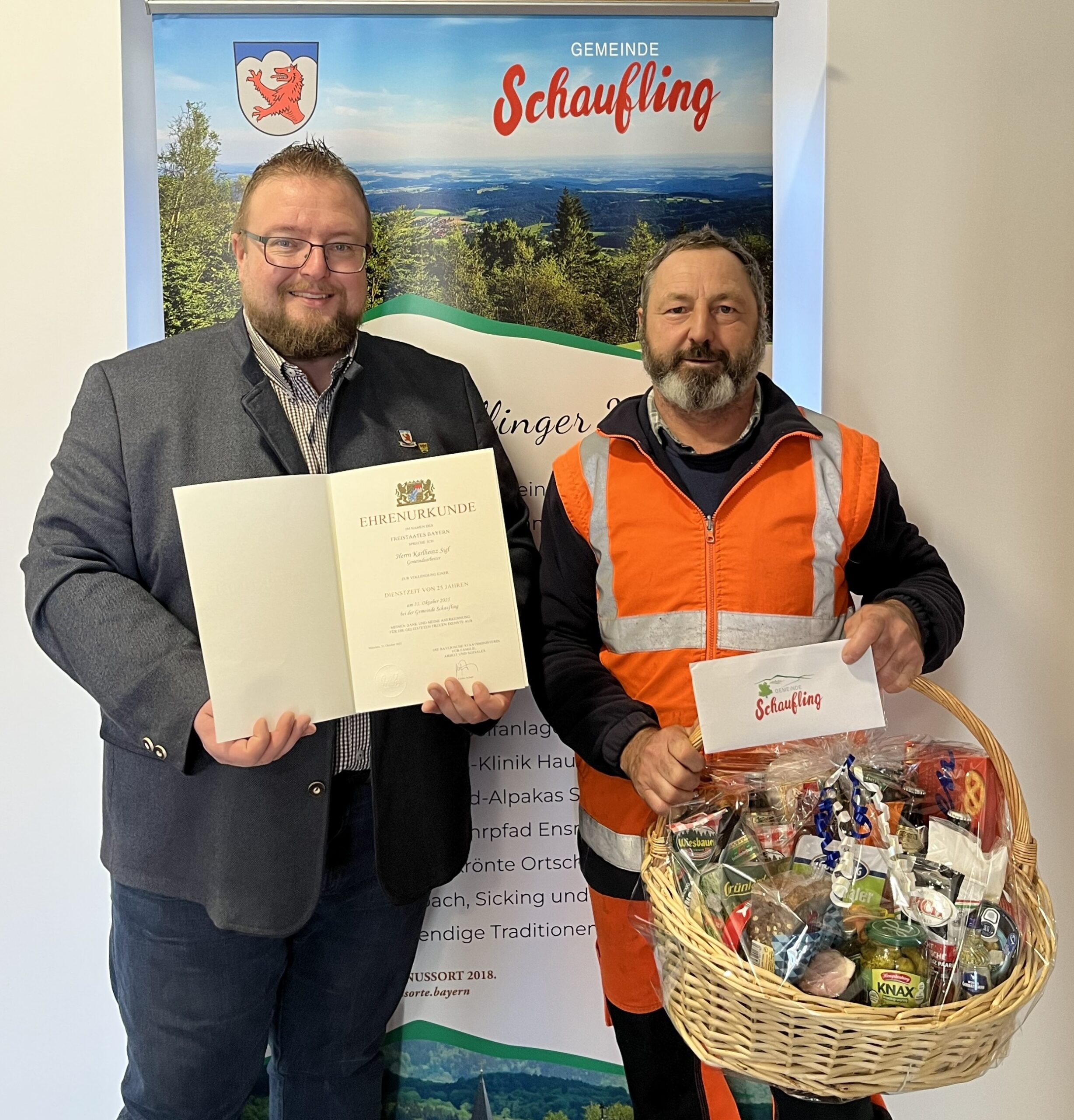 Ein Vierteljahrhundert im Dienst der Gemeinde – das ist eine stolze Leistung, die Respekt und Anerkennung verdient. In den Räumlichkeiten des neuen Bürgerbüros im „Schauflinger Hof“ wurde Bauhofmitarbeiter Karl Sigl kürzlich daher für seine 25-jährige Tätigkeit im öffentlichen Dienst geehrt. Bürgermeister Robert Bauer gratulierte im Namen der Gemeinde ganz herzlich und überreichte neben einer monetären Anerkennung auch die offizielle Ehrenurkunde des Bayerischen Staatsministeriums für Familie, Arbeit und Soziales, unterzeichnet von Staatsministerin Ulrike Scharf.