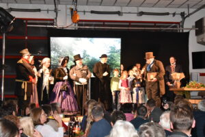Im zweiten Teil der Veranstaltung „A Midanand im Hirgst“ unterhielten sich Herzog Otto III, damaliger Herzog von Niederbayern und Mönch Wernhard, damaliger Abt von Niederaltaich unter der Schauflinger Dorflinde, die im Hintergrund eingeblendet war. Mit dem Titel „Über d’Berg, über’n Woid und über d’Leid“ streiften die Themen über Schauflings Geschichte bis hin zur heutigen Zeit. Während der Herzog eine deftige Brotzeit verzehrte, berichtete der Abt etwa über Schnupferin Anke Dreßler, den Tannerbauer Lois, oder den Ursprung des Ortsnamens: Ob der aber von dem Ausspruch „Schau, flink sans“ oder von „Geh, loß die Schaufl ling“ stammt, konnte nicht abschließend geklärt werden. Auch das Lungensanatorium am Hausstein, das Golfen auf der Rusel oder die Umgemeindung Böhamings wurden bei dem Disput thematisiert, ebenso die Abfolge der Schauflinger Bürgermeister. Zum Schluss wurde eine Schiefertafel enthüllt, auf der sich die Namen sämtlicher Ehrenbürger und Bürgermedaillenträger der Gemeinde befinden. Diese soll ihren Platz künftig im neuen Bürgerzentrum finden.