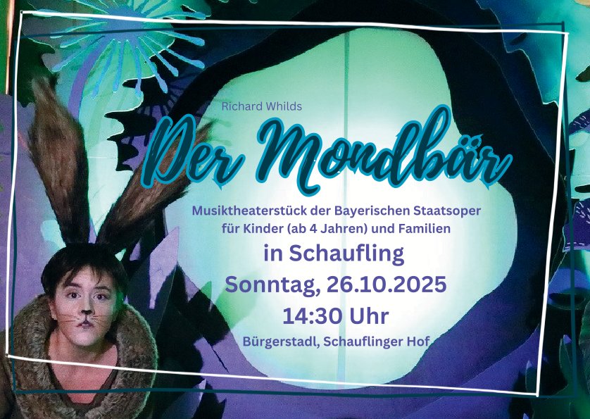 Ein leuchtendes Erlebnis für alle (kleinen) Theaterfans: Am Sonntag, 26. Oktober 2025, verwandelt sich der Bürgerstadl im Schauflinger Hof in eine Bühne voller Poesie und Musik. Um 14:30 Uhr hebt sich dort der Vorhang für „Der Mondbär“, ein Musiktheaterstück der Bayerischen Staatsoper für Kinder ab 4 Jahren und ihre Familien.
