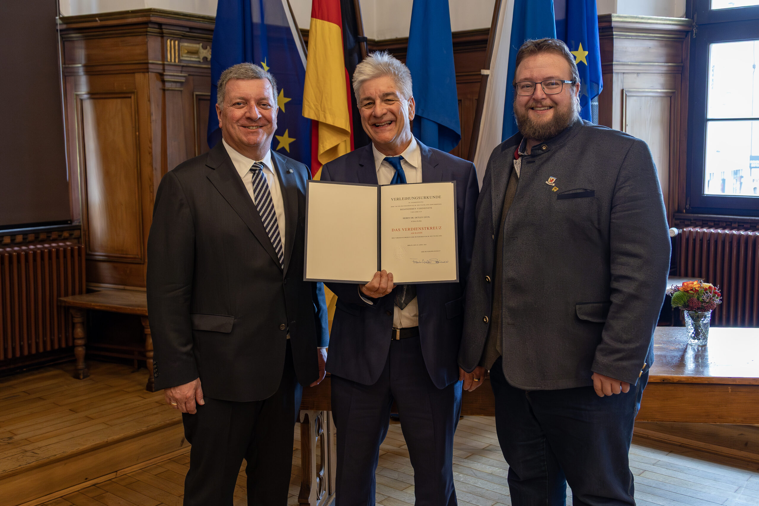 Verdiente Auszeichnung für den selbstlosen Einsatz von Detlev Gück sowie das unternehmerische und gesellschaftliche Engagement von Toni Fink: Stellvertretend für Bundespräsident Frank-Walter Steinmeier hat Staatsminister Christian Bernreiter ihnen und zwei weiteren Niederbayern am Samstag das Bundesverdienstkreuz am Bande angeheftet. Mit diesem Verdienstorden würdigt die Bundesrepublik Deutschland ehrenamtliches Engagement, das weit über das Selbstverständliche hinaus geht.